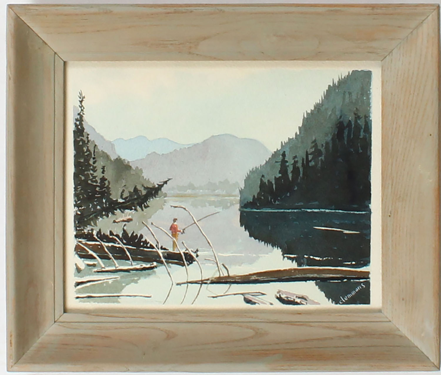 Original Watercolor by Ralph H. Clemmons, pictures fly fisherman on snowy log on lake, 9'' x 7'' image size, framed. Grade: Excellent ++ - Value: 10 to 80