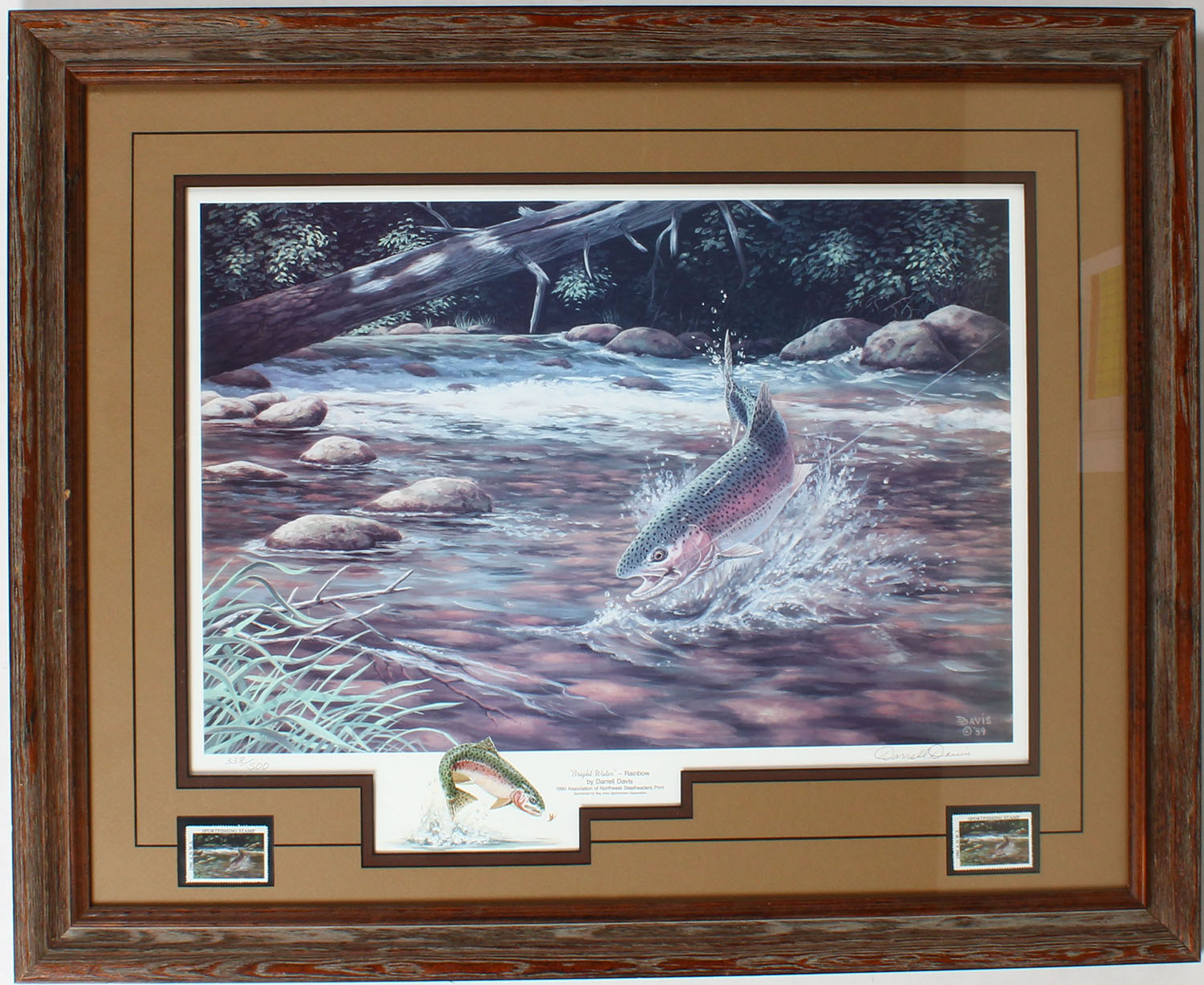 Bright - Waters Rainbow by Darrell Davis print with wonderful full color artist proof, pictures a large rainbow trout taking a fly above water, has two sportfishing stamps, 388/500, 20: x 13 1/2'' image size, framed. Grade: Excellent ++ - Value: 50 to 500
