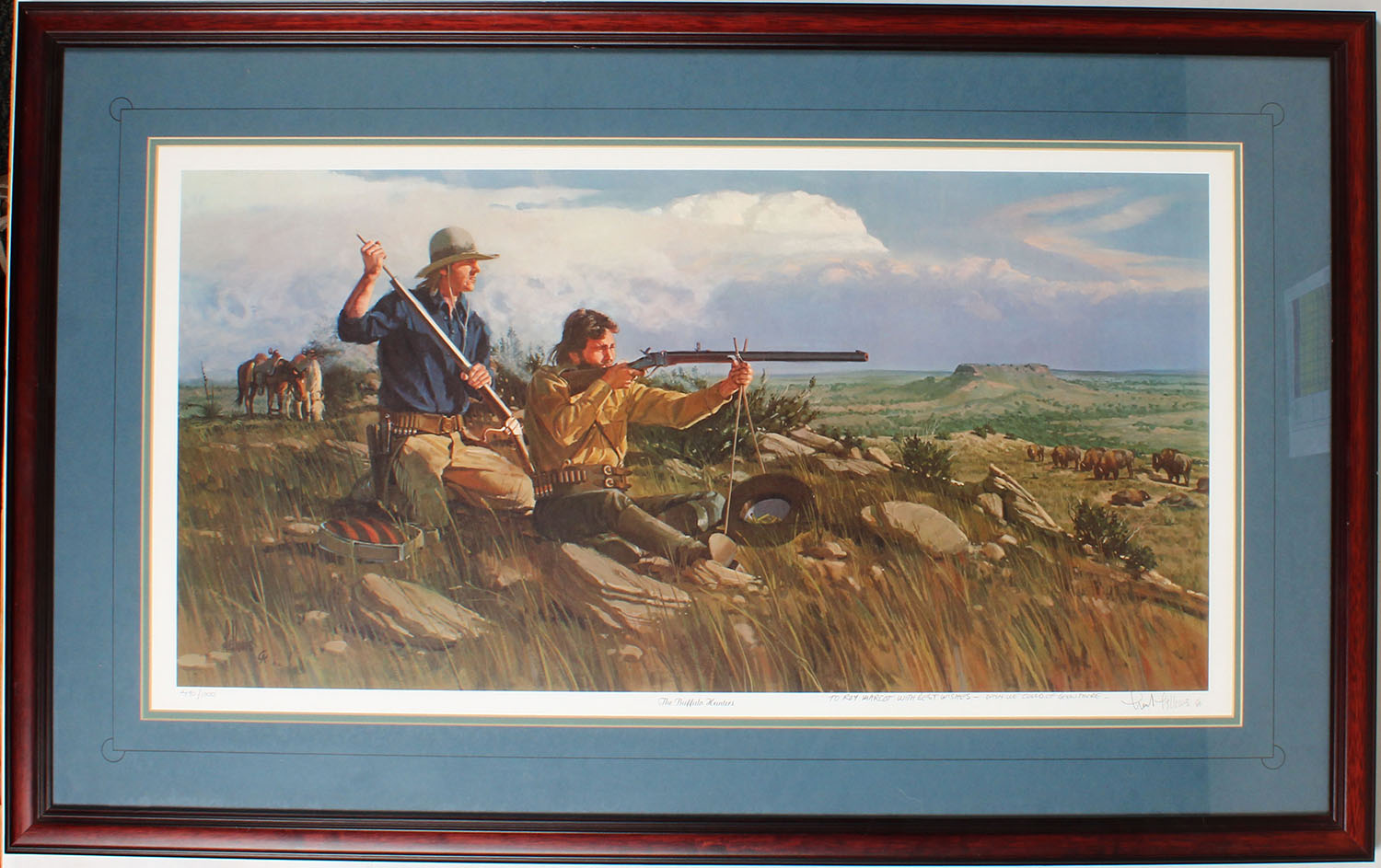 The Buffalo Hunters print by Fellows, hand written below image by artist ''TO ROY MARCOT WITH BEST WISHES - WISH WE COULD HAVE BEEN THERE'', pictures two buffalo hunters shooting at a herd of buffalo, 32'' x 16'' image size, 490/1000, framed. Grade: MINT - Value: 50 to 250