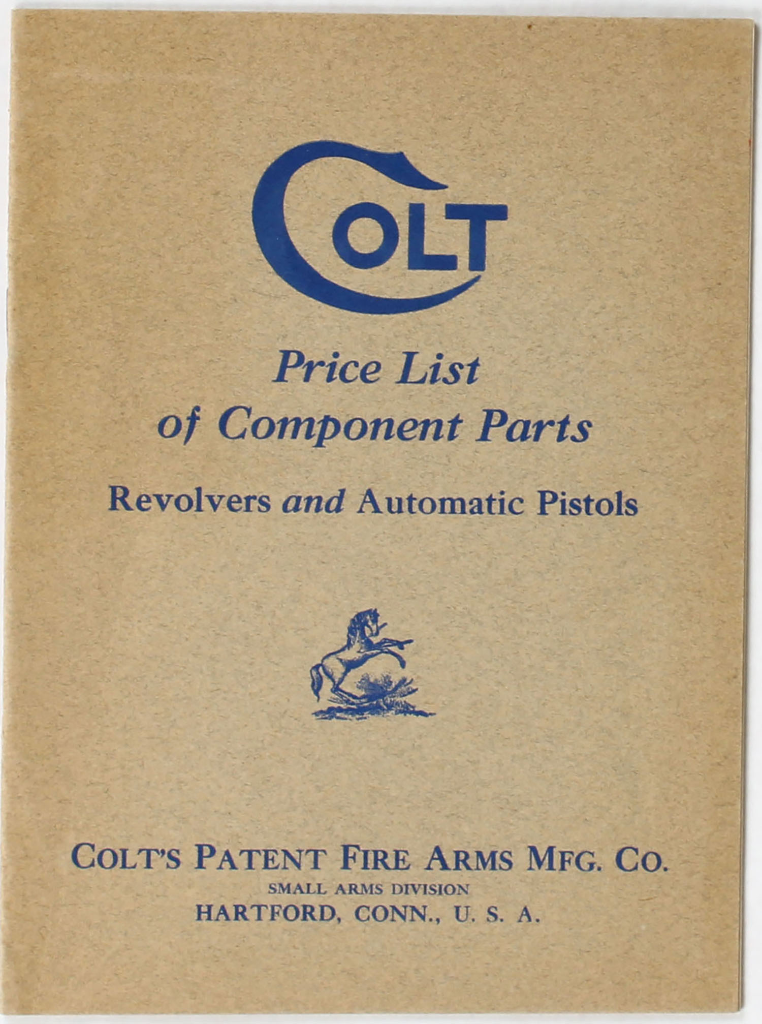 1928 Colt Price List of Component Parts Booklet, 15 pages, 5 3/4'' x 7 3/4'', many parts for many different pistols are listed. Grade: Excellent + - Value: 40 to 150