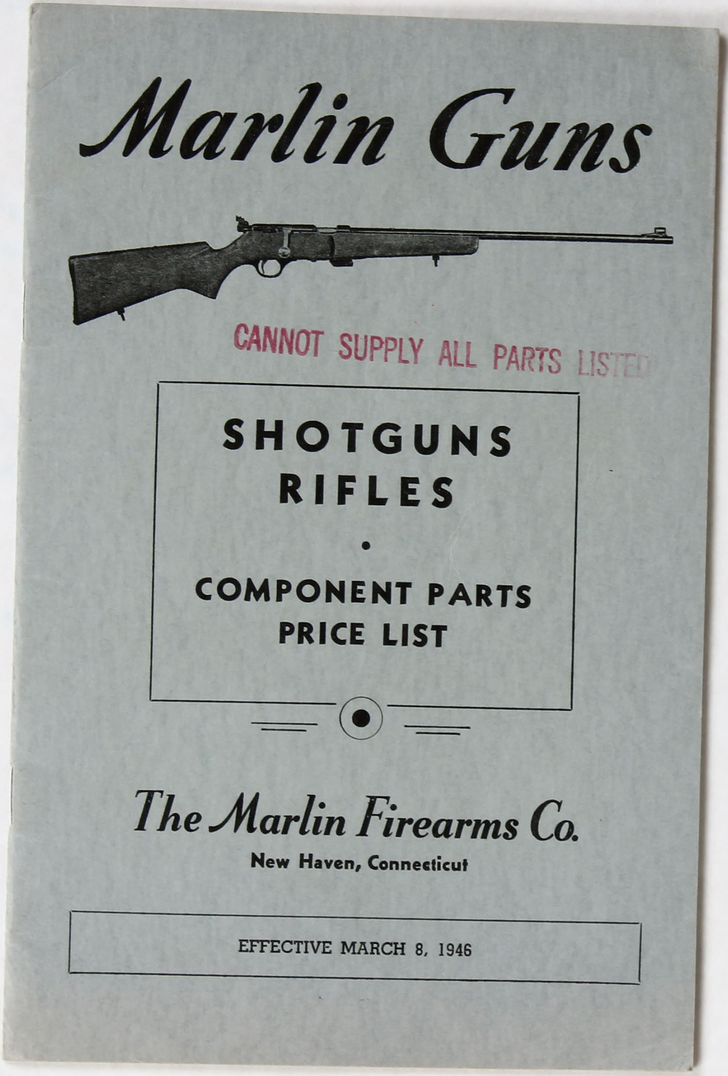 1946 Marlin Guns catalog for component parts price list for shotgun & Rifles, 23 pages, 5 1/2'' x 8 1/2''. Grade: Excellent - Value: 10 to 50