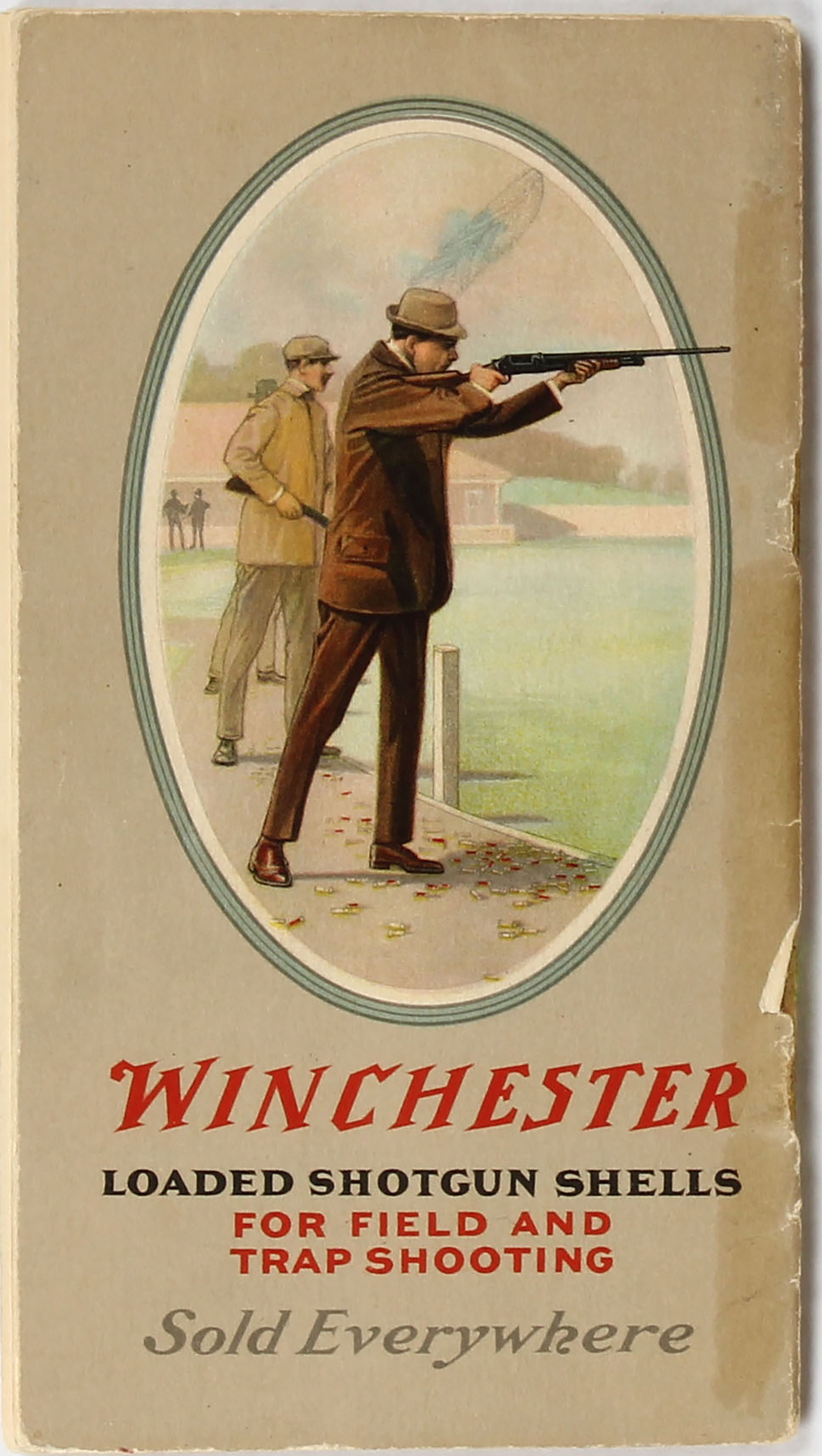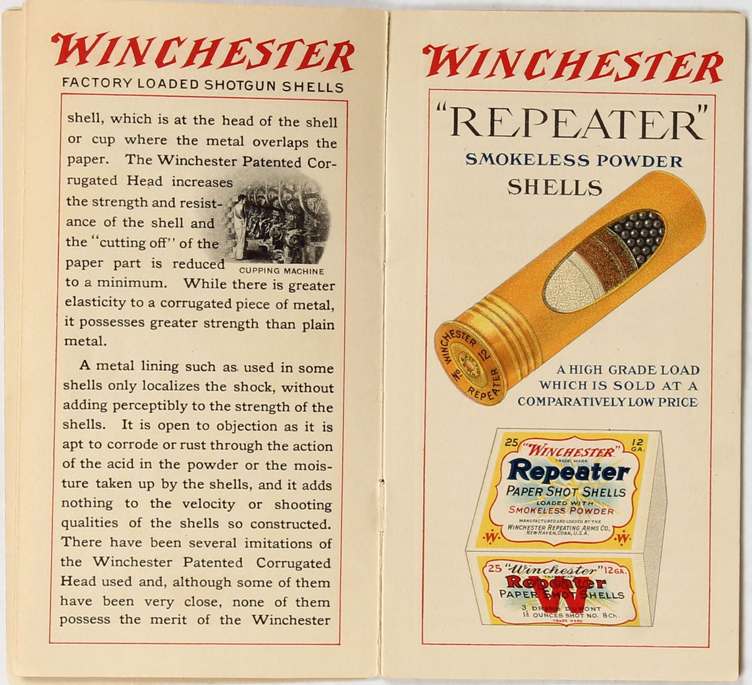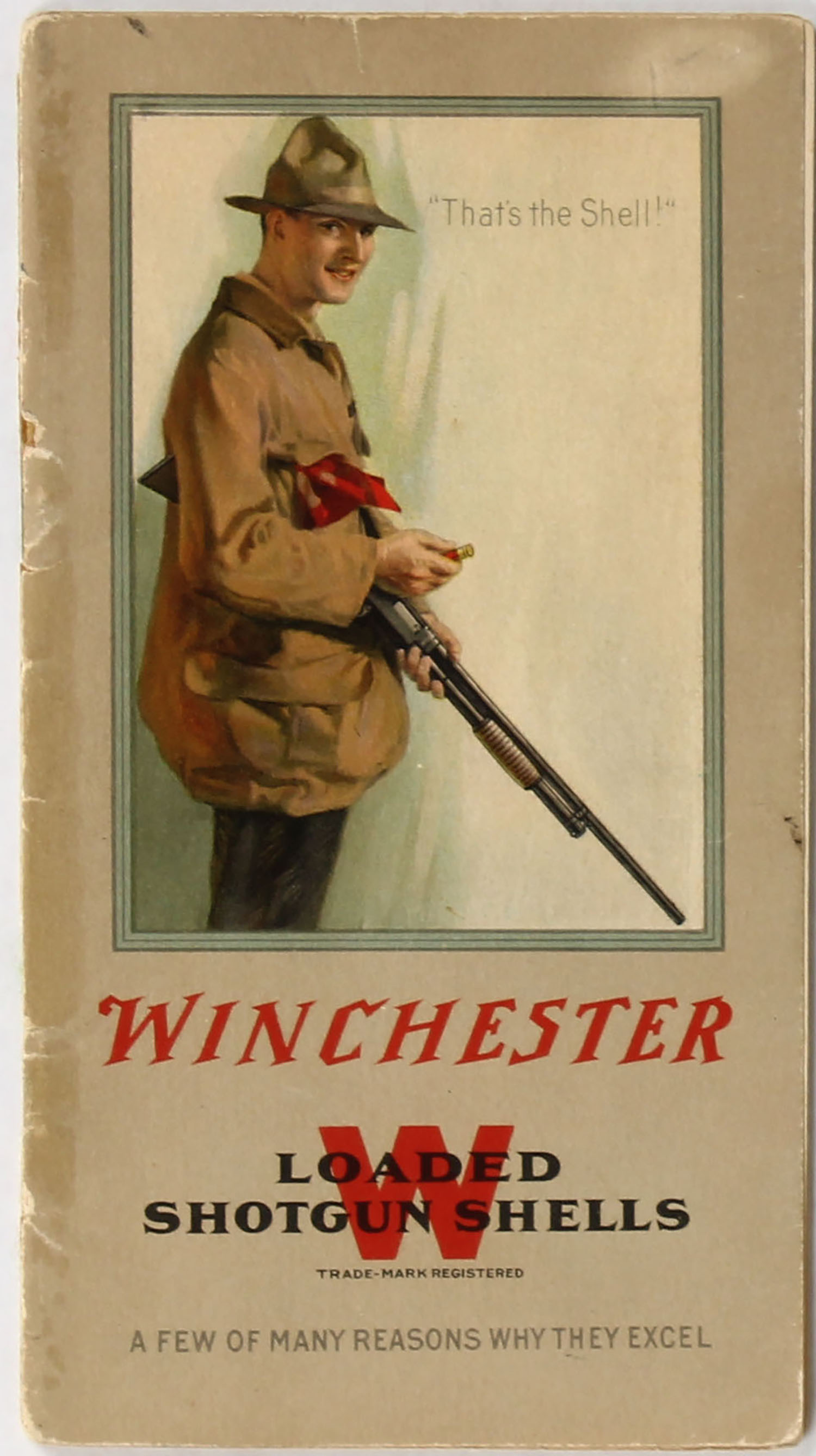 Winchester Loaded Shotgun Shells booklet, has fantastic full color pages of 2pc shotshell boxes (Repeater, Leader, New Rival, Nublack & a window shell for each box, front & back picture nice early hunter or trap shooter, cover & pages are coming loose at binding, would look great to frame all pages flat. Grade: Good ++ - Value: 10 to 80