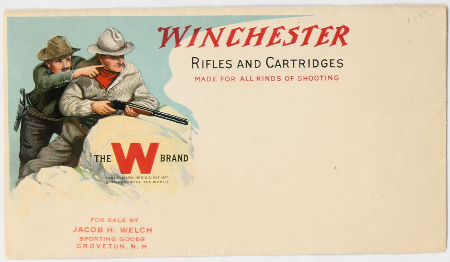 Winchester Envelope with advertising, wonderful full color image of two men looking over a rock and big game, wonderful red, blue and black print on back, Unused, very bright and clean!! Grade: Excellent - Value: 50 to 200