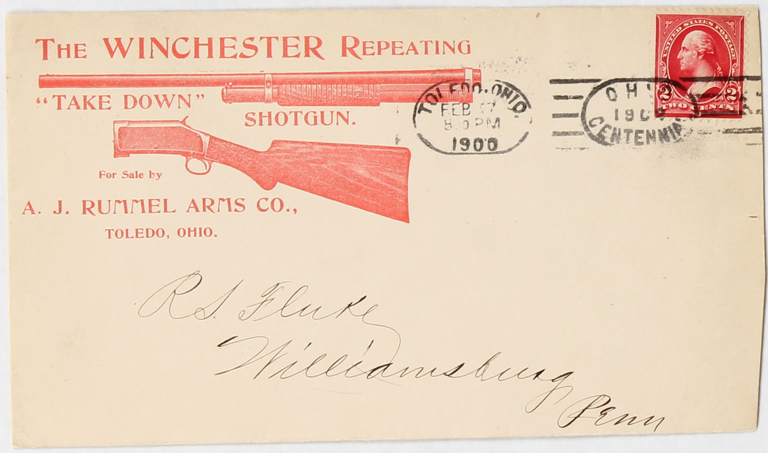 Winchester Envelope with advertising for repeating take down shotgun, red print on back, used! Grade: Excellent - Value: 20 to 100