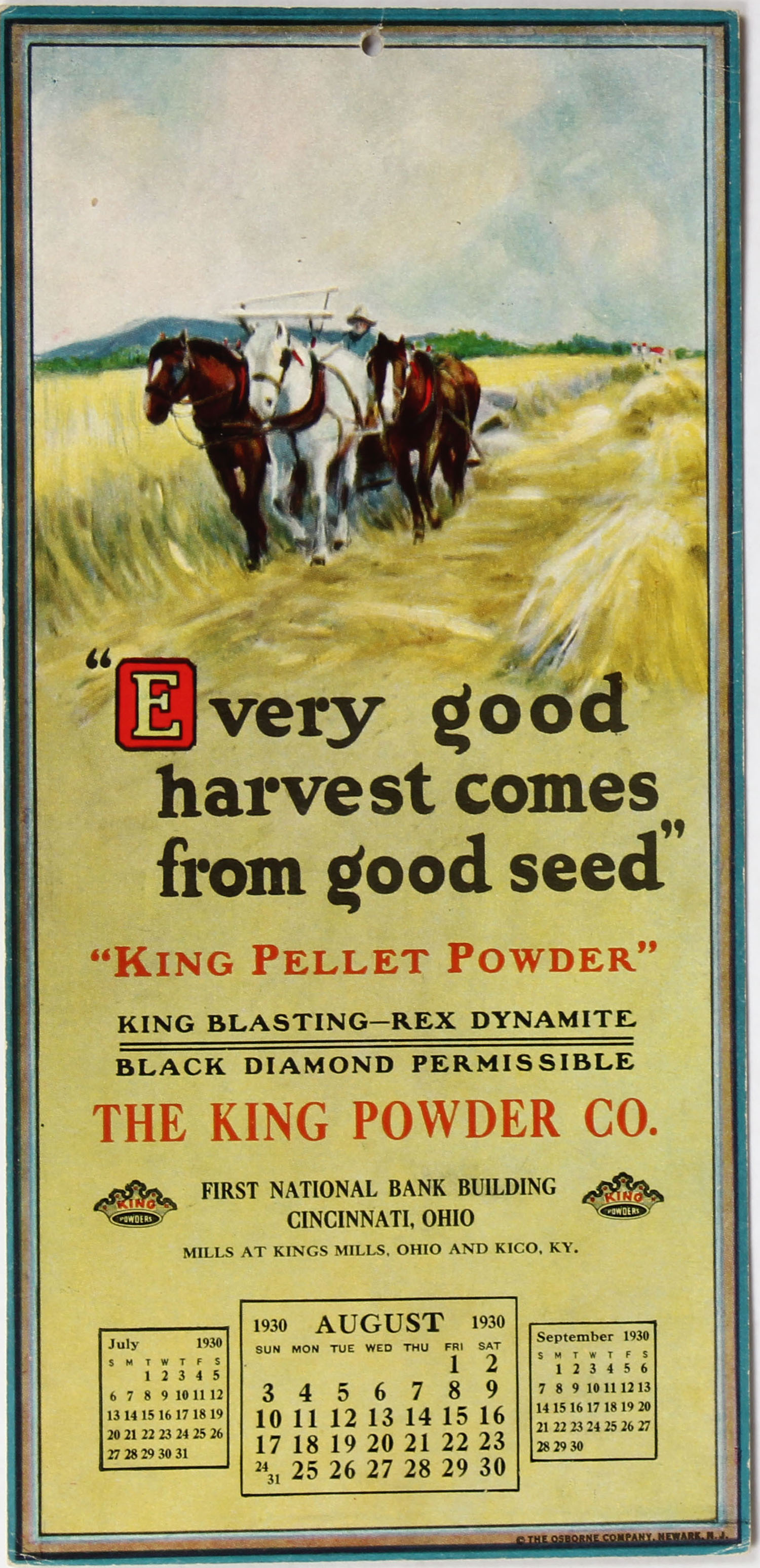 1930 The King Powder Co. Calendar, 4 3/4'' x 10''. Grade: Excellent ++ - Value: 20 to 100