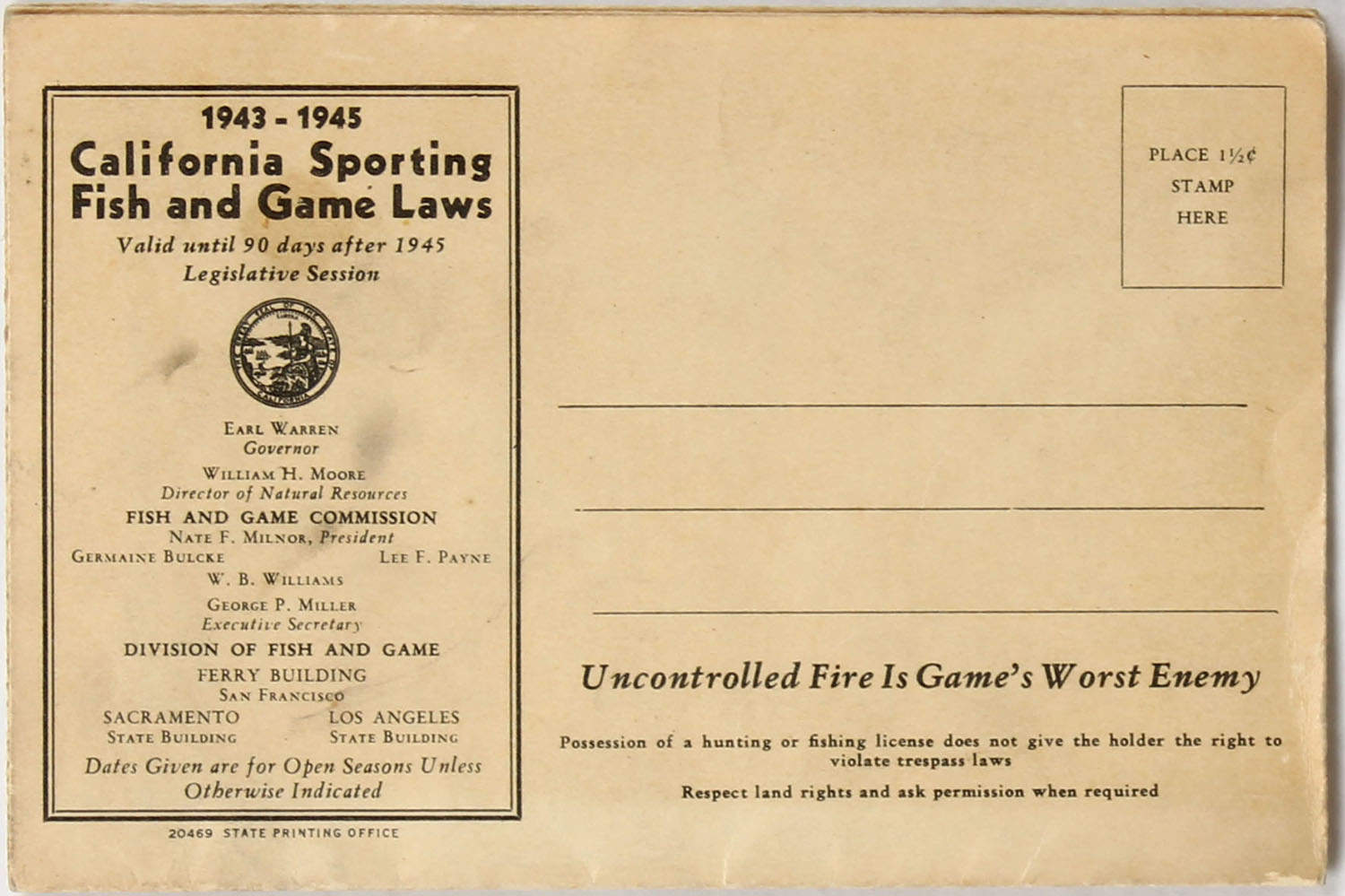 1943 California Sporting Fish & Game Laws booklet. Grade: Excellent - Value: 6 to 30