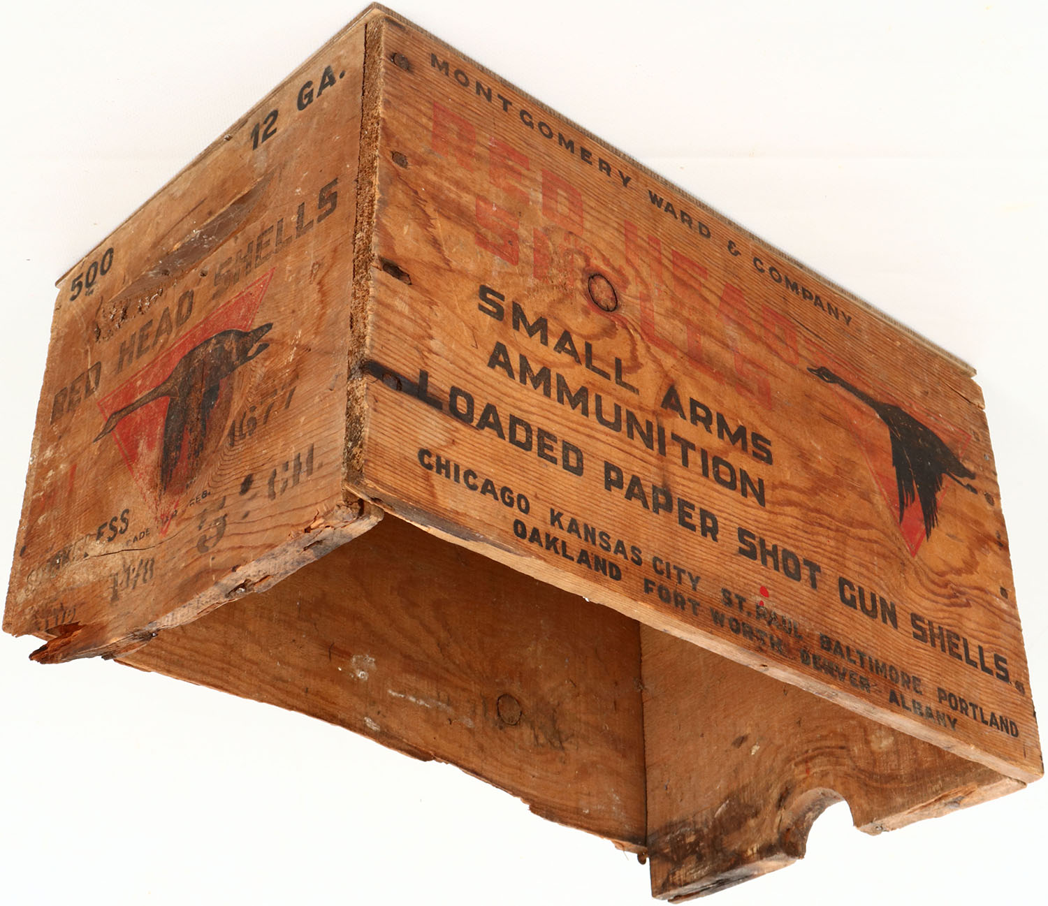 Wards, Red Head with goose flying through triangle logo, 12 ga., No 5 ch., nail construction wood shipping crate, red & black print has fading, crate has age soiling and chipping to the edge of 2 sides and doesn't have a bottom or top piece. Grade: Very Good - Value: 20 to 200