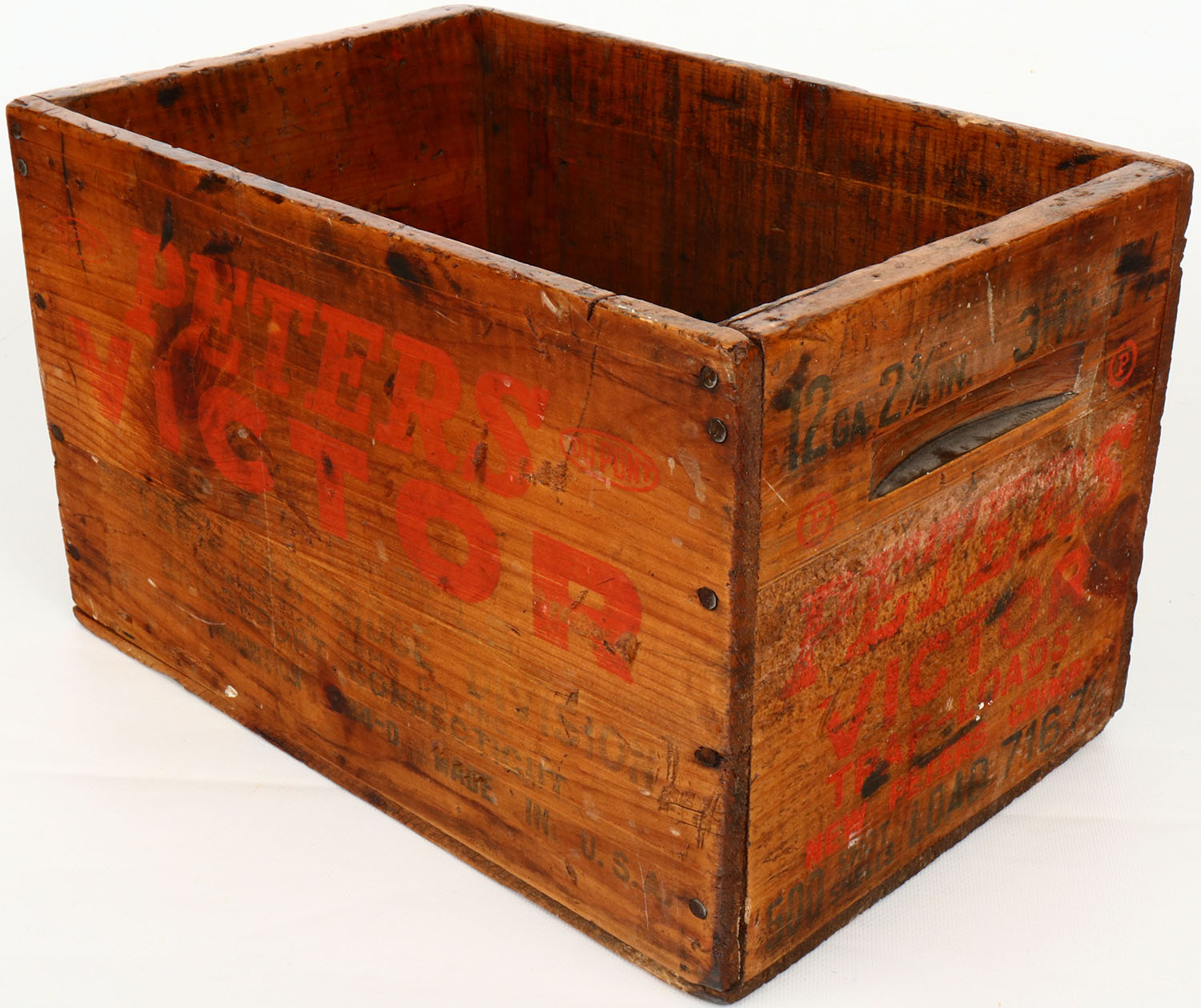 Peters Victor 12 ga., nail construction, orange & blue print is solid, crate has lots of age soiling. Grade: Very Good - Value: 10 to 40
