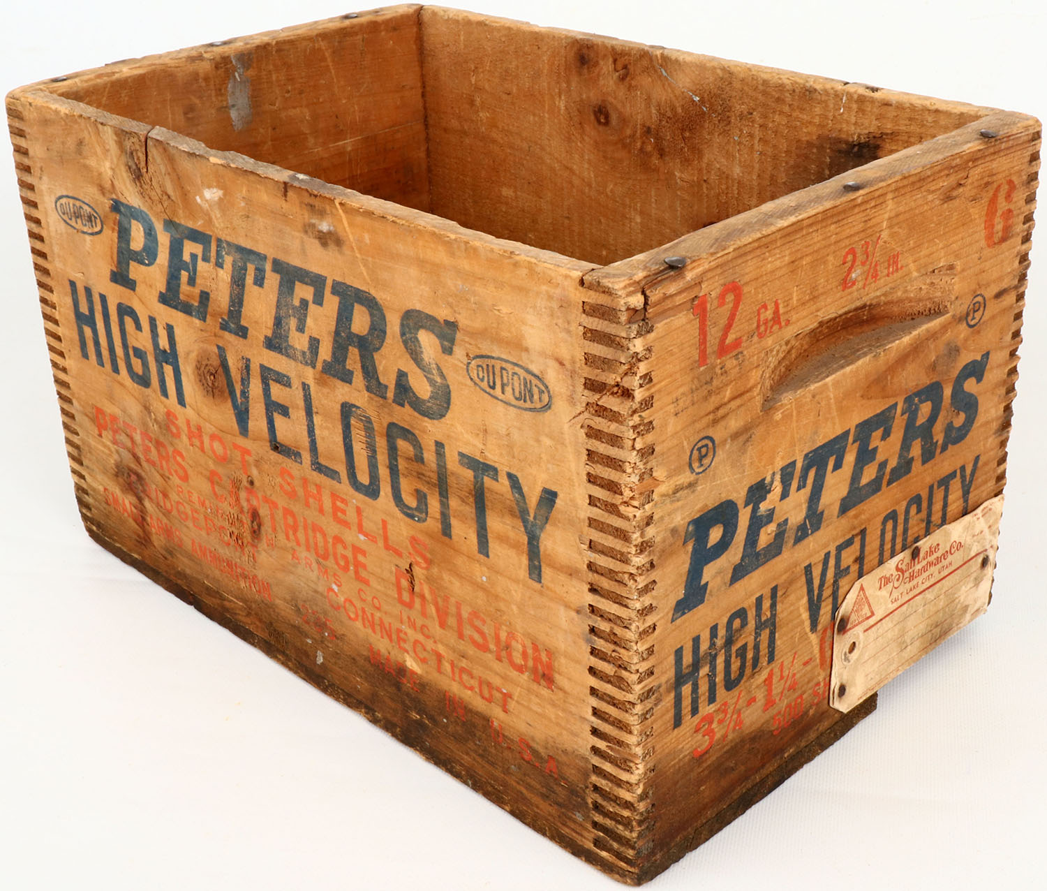 Peters High Velocity 12 ga. ga., tongue and groove construction, orange & blue print is solid, crate has some light age soiling and missing bottom piece. Grade: Good ++ - Value: 6 to 40
