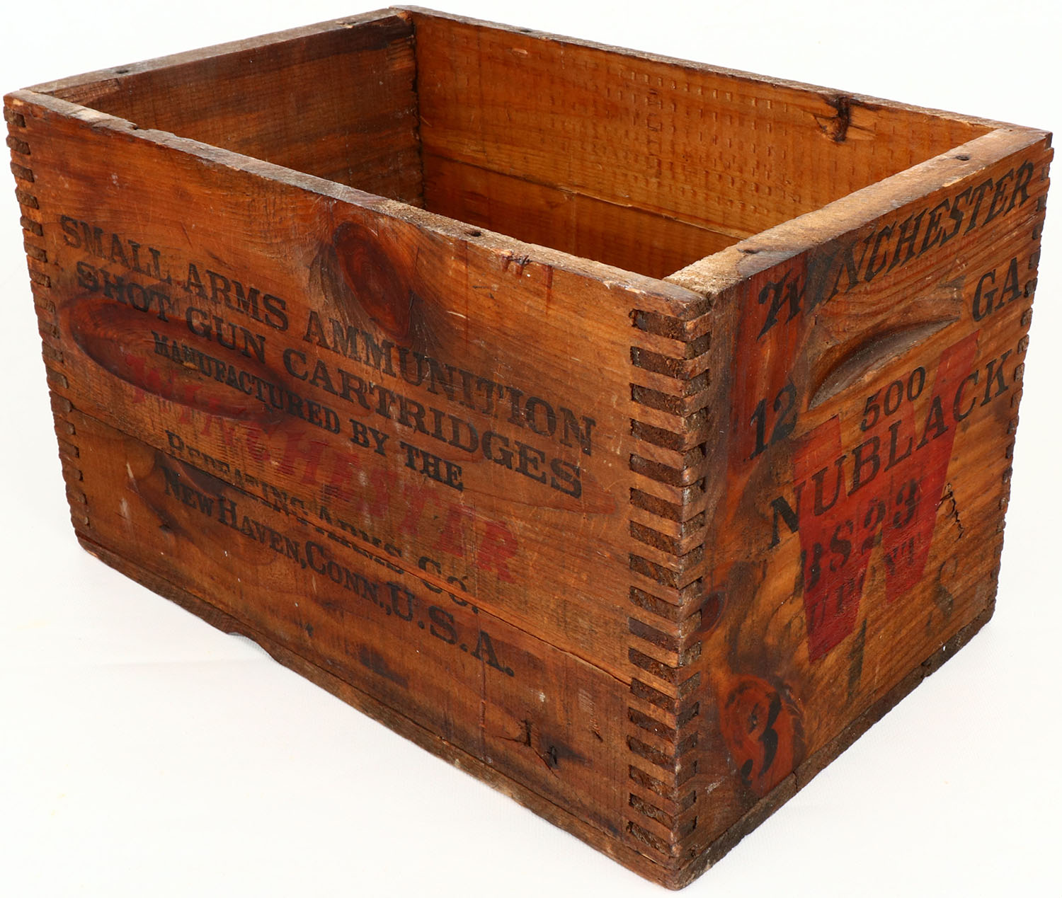 Winchester, Nublack, 12 Ga., tongue and groove construction, red, & black 3 - 1 - 8, print is faded and crate has some age soiling. Grade: Very Good + - Value: 30 to 90