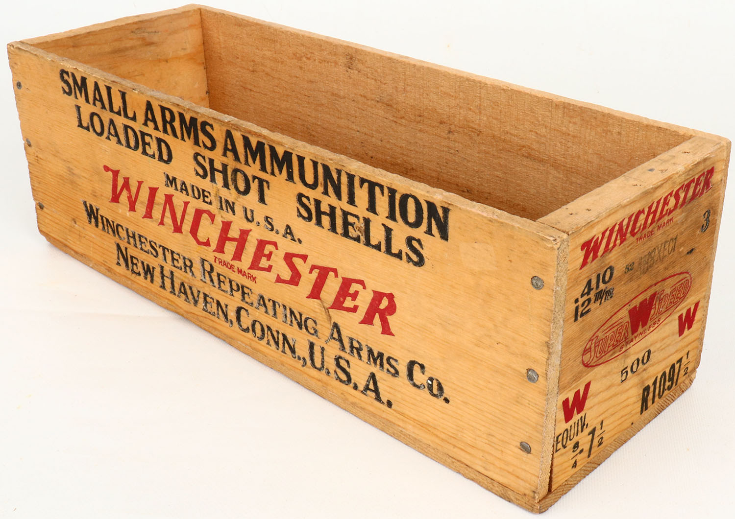 Winchester Super Speed, 410 Ga., 3'', nail construction wood shipping crate, black & Red print and crate are very bright and clean. Grade: Excellent ++ - Value: 30 to 90