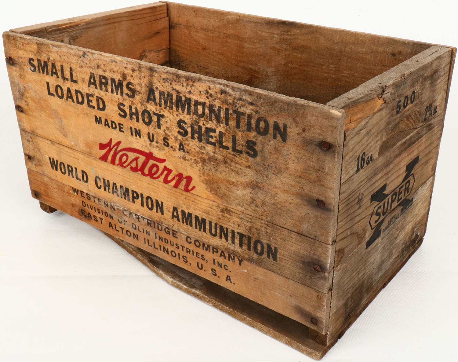 Western Super-X, 16 Ga., 2 3/4, 6 Ch., nail construction wood shipping crate, black & red print is faded, and the crate has some age soiling. Grade: Very Good - Value: 6 to 40