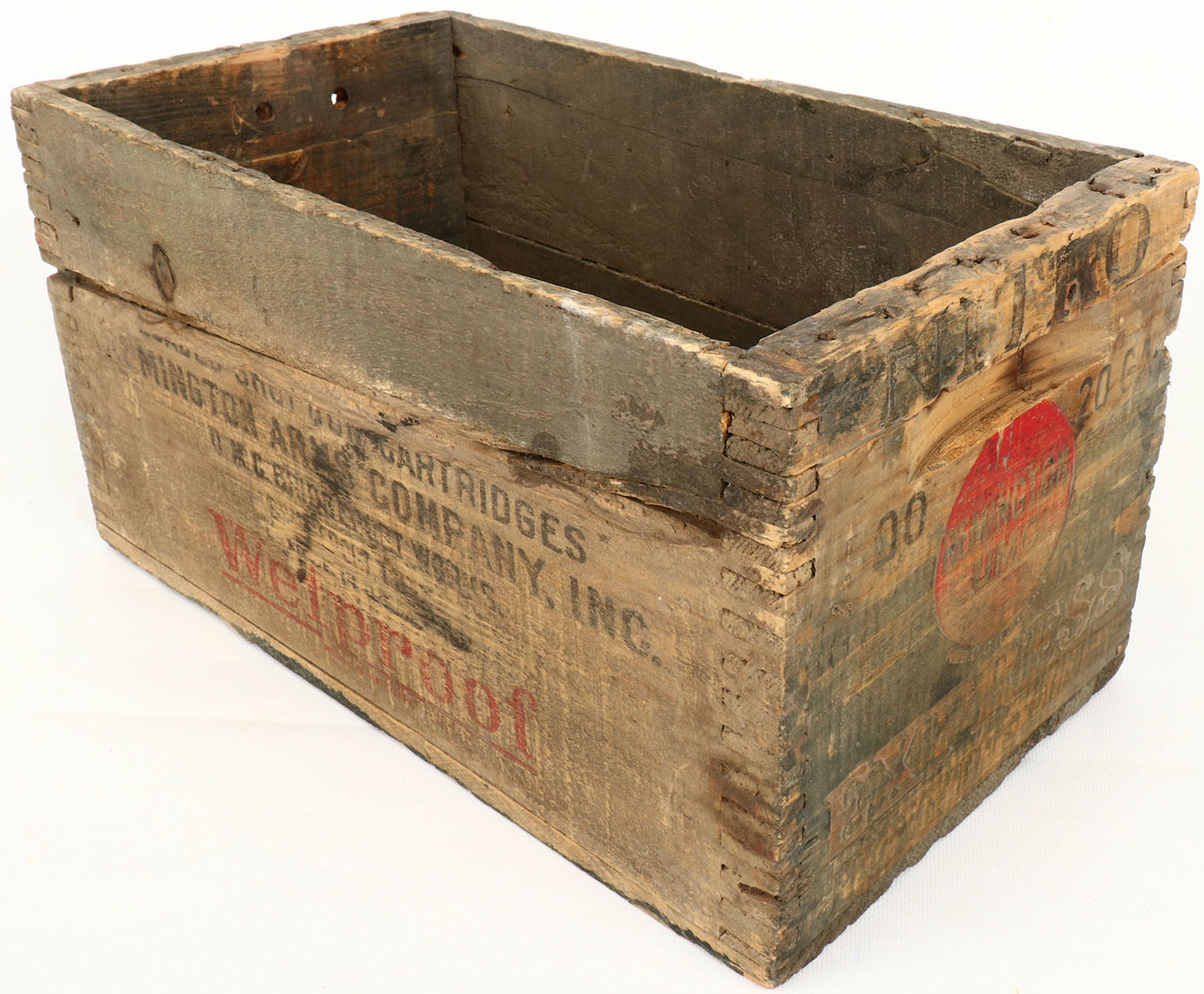 Remington UMC Nitro Express, 20 Ga., tongue and groove construction wood shipping crate, black & red print has some fading and the crate has age soiling. Grade: Very Good - Value: 2 to 50