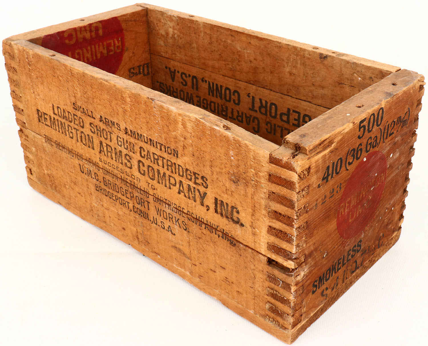 Remington UMC 410 Ga., 7 1/2 ch., tongue and groove construction wood shipping crate, black & red print is solid and the crate has age soiling. Grade: Very Good ++ - Value: 20 to 100