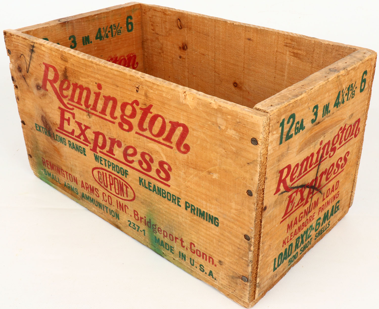 Remington Express, 12 Ga., 6 shot, nail construction, red, & green print have some fading and crate has age soiling. Grade: Very Good - Value: 16 to 60