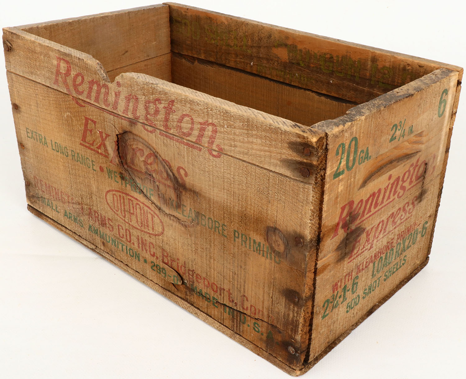 Remington Express, 20 Ga., 6 shot, nail construction, red, & green print have some fading and crate has age soiling. Grade: Very Good - Value: 2 to 60