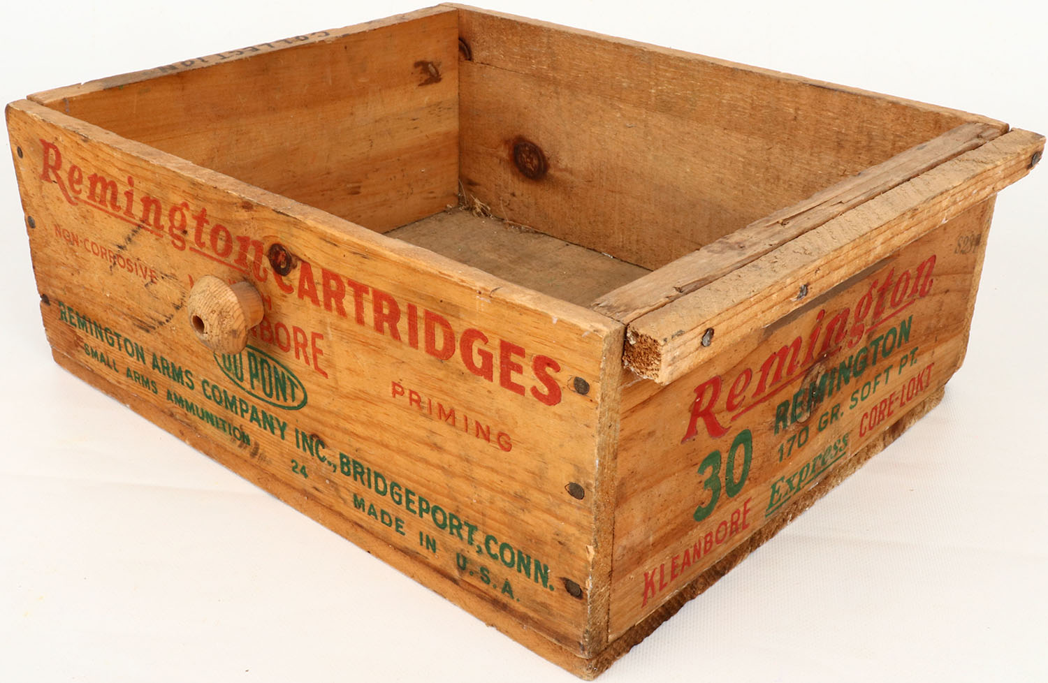 Remington .30 Remington., nail construction, red, & green print is solid, crate has some age soiling. Grade: Very Good ++ - Value: 16 to 60