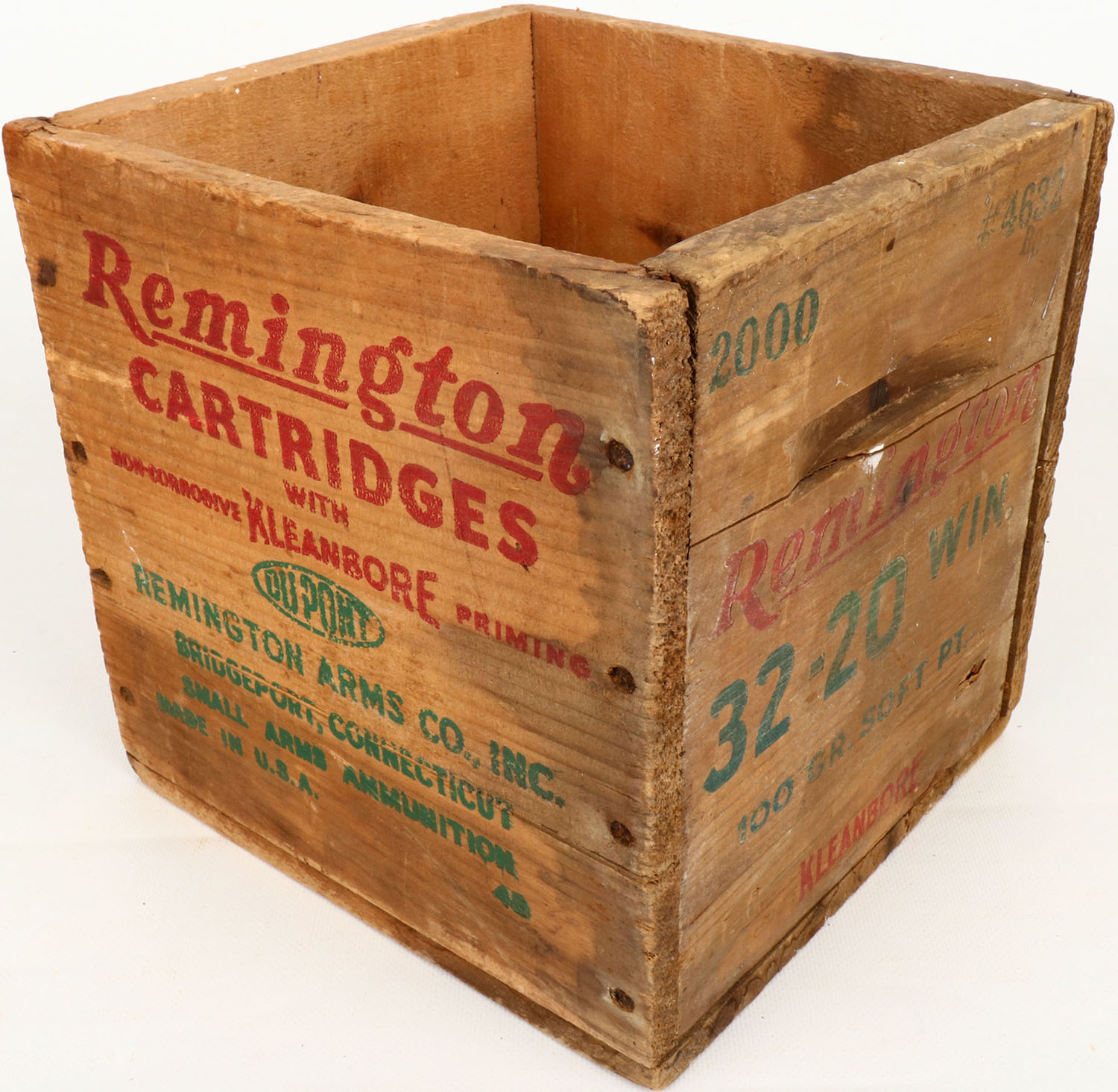 Remington 32-20 Win., nail construction, red, & green print is solid, crate has some age soiling spots. Grade: Very Good ++ - Value: 10 to 50