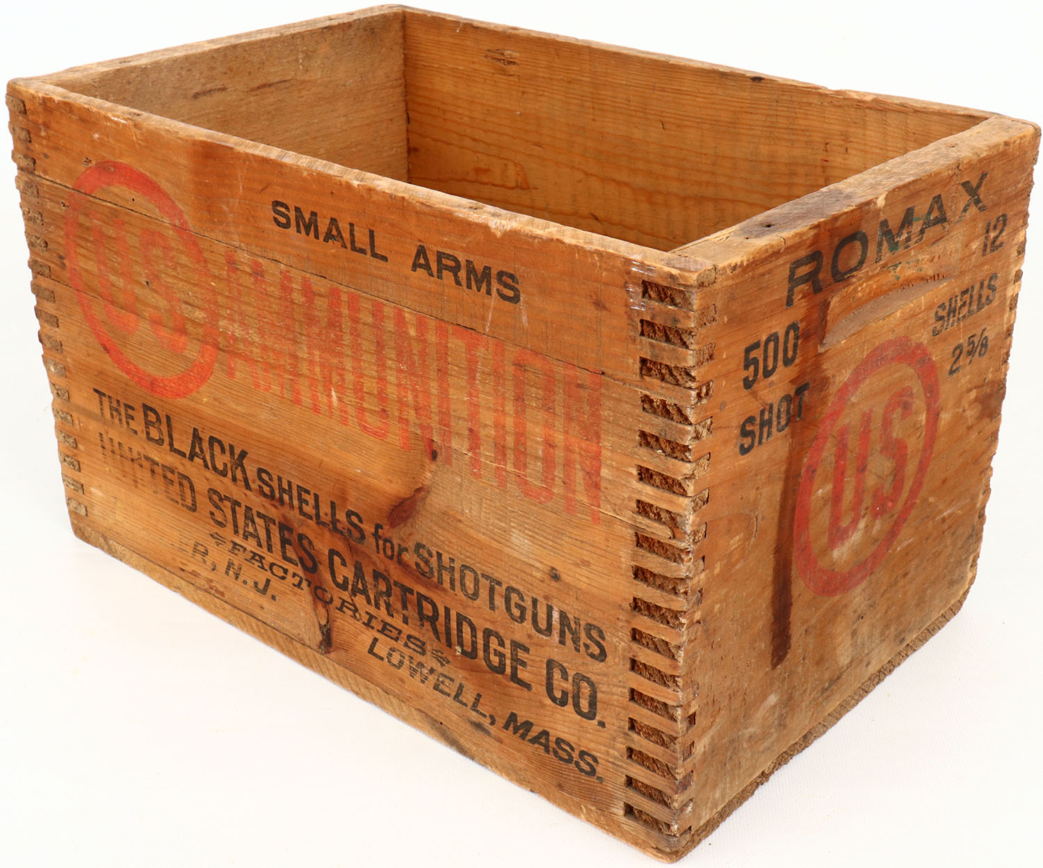 US THE BLACK SHELLS ROMAX, 12 ga., Smokeless, tongue and groove construction wood shipping crate, red & black print is fading, crate is solid. Grade: Very Good ++ - Value: 30 to 90