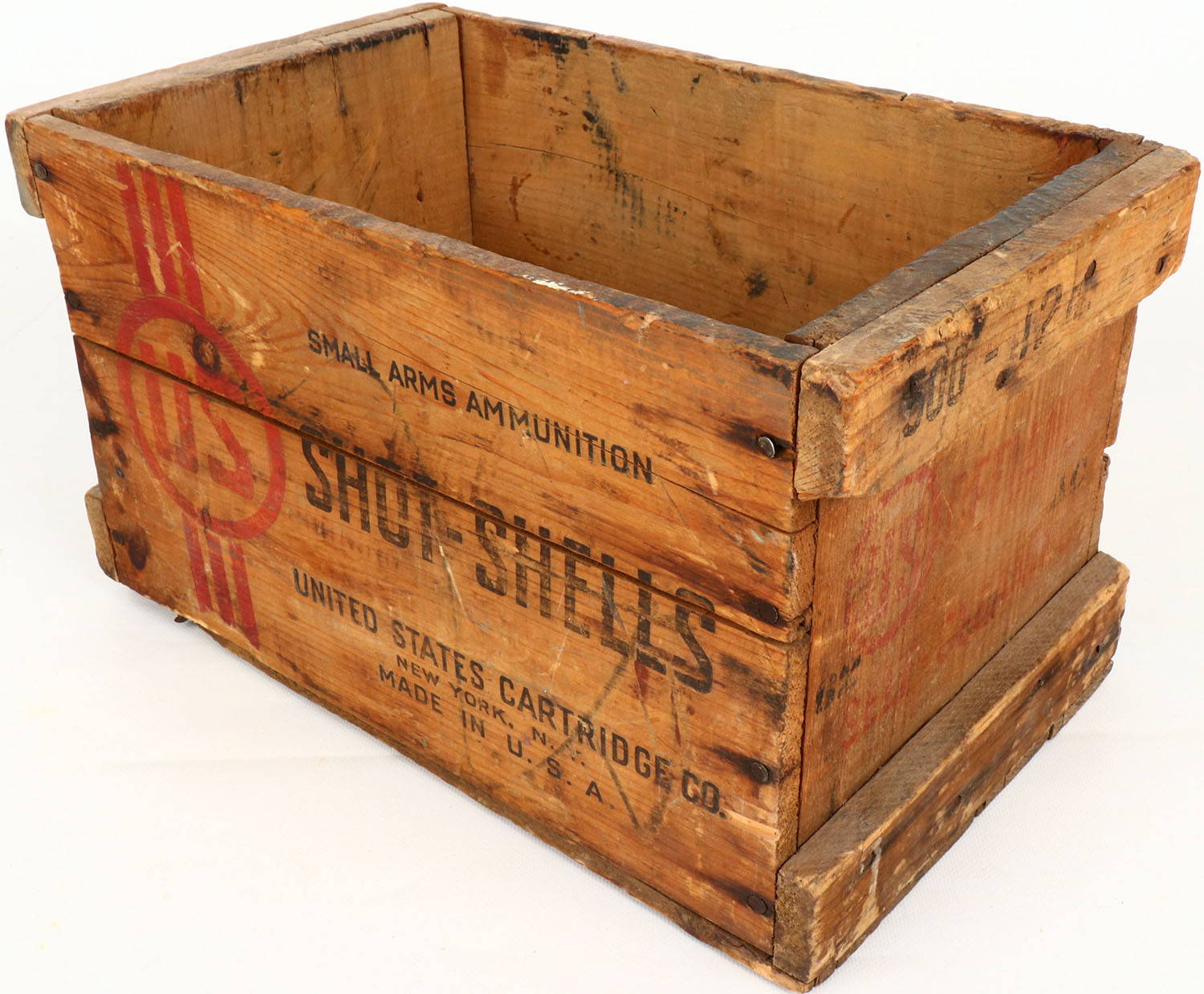 US 12 ga., nail construction wood shipping crate, red & black print is faded, crate has age soiling. Grade: Very Good - Value: 10 to 50