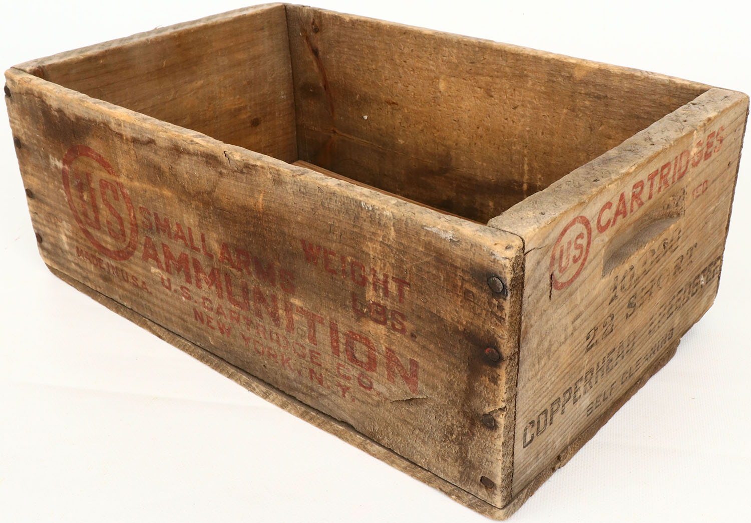 US 22 Short, nail construction wood shipping crate, red print is faded, crate has age soiling. Grade: Very Good - Value: 6 to 40