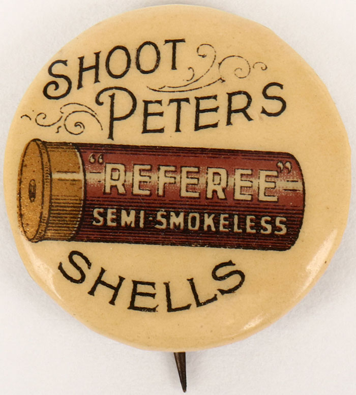 Peters Pinback, ''Shoot Peters Shells'', 7/8'', Bastains Bros paperback, pin and paperback are bright and clean . Grade: Excellent ++ - Value: 20 to 100