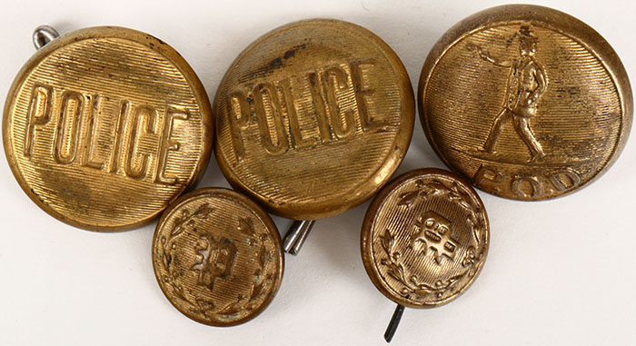 Lot of 5 pinbacks, 2 marked Police, 1 marked POD and 2 with just a symbol. Grade: Excellent - Value: 2 to 80