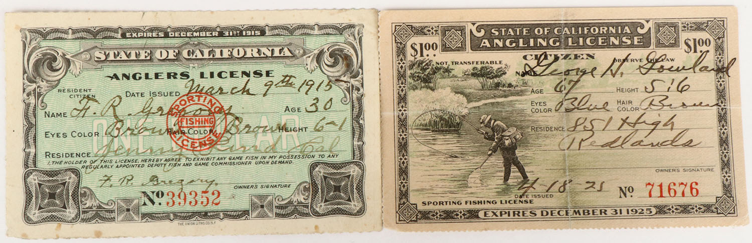 Lot of two RARE and EARLY California Fishing License, 1915 & 1925, great background graphics. Grade: Excellent - Value: 20 to 80