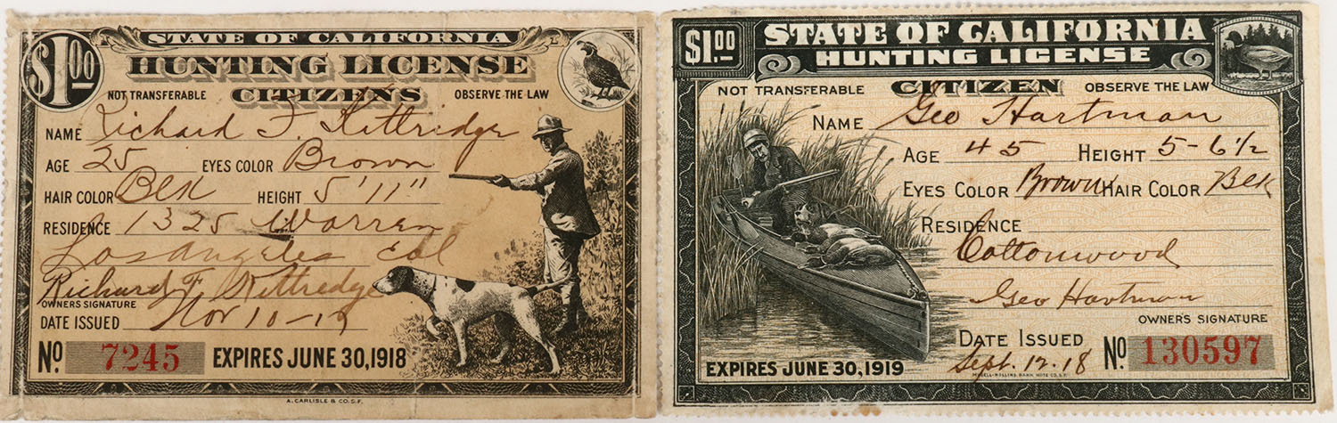 Lot of 2 RARE and EARLY California Hunting License, 1918/1919. Grade: Excellent - Value: 20 to 80