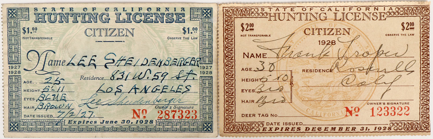 Lot of 2 RARE and EARLY California Hunting License, 1928. Grade: Excellent - Value: 10 to 50