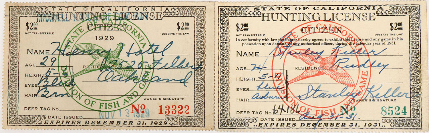 Lot of 2 RARE and EARLY California Hunting License, 1929/1931. Grade: Excellent - Value: 10 to 50