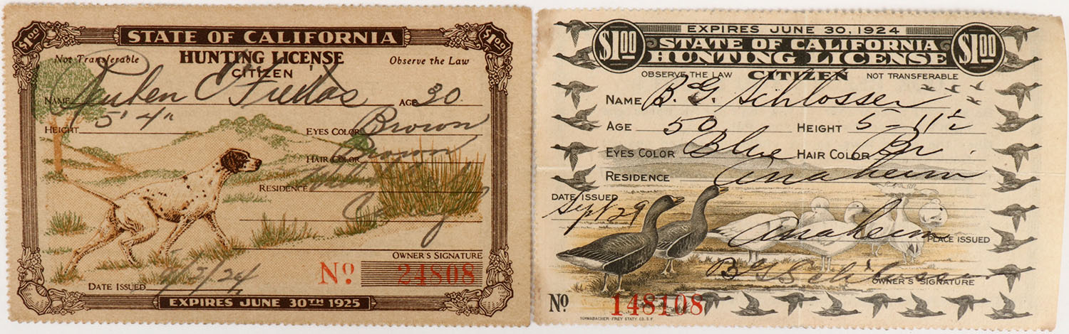 Lot of 2 RARE and EARLY California Hunting License, 1925/1924. Grade: Excellent - Value: 20 to 80
