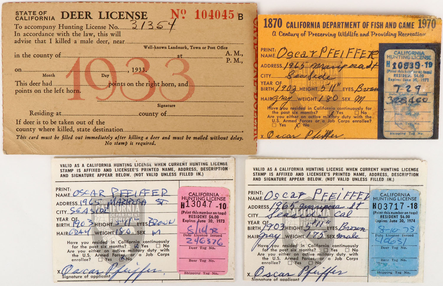 Lot of 4 California Hunting License. Grade: Excellent - Value: 2 to 50