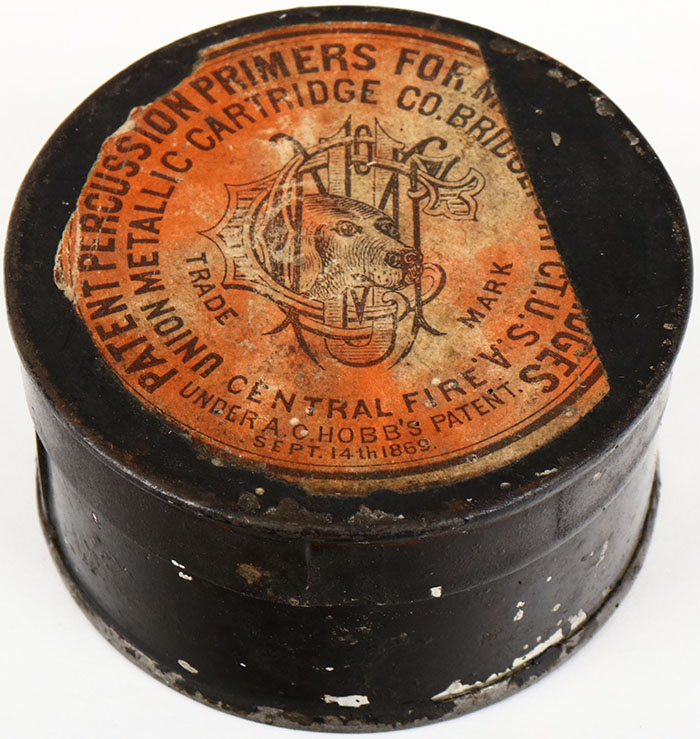 Early UMC early dog head logo percussion primers, Empty, has some age soiling and is torn. Grade: Very Good - Value: 6 to 60