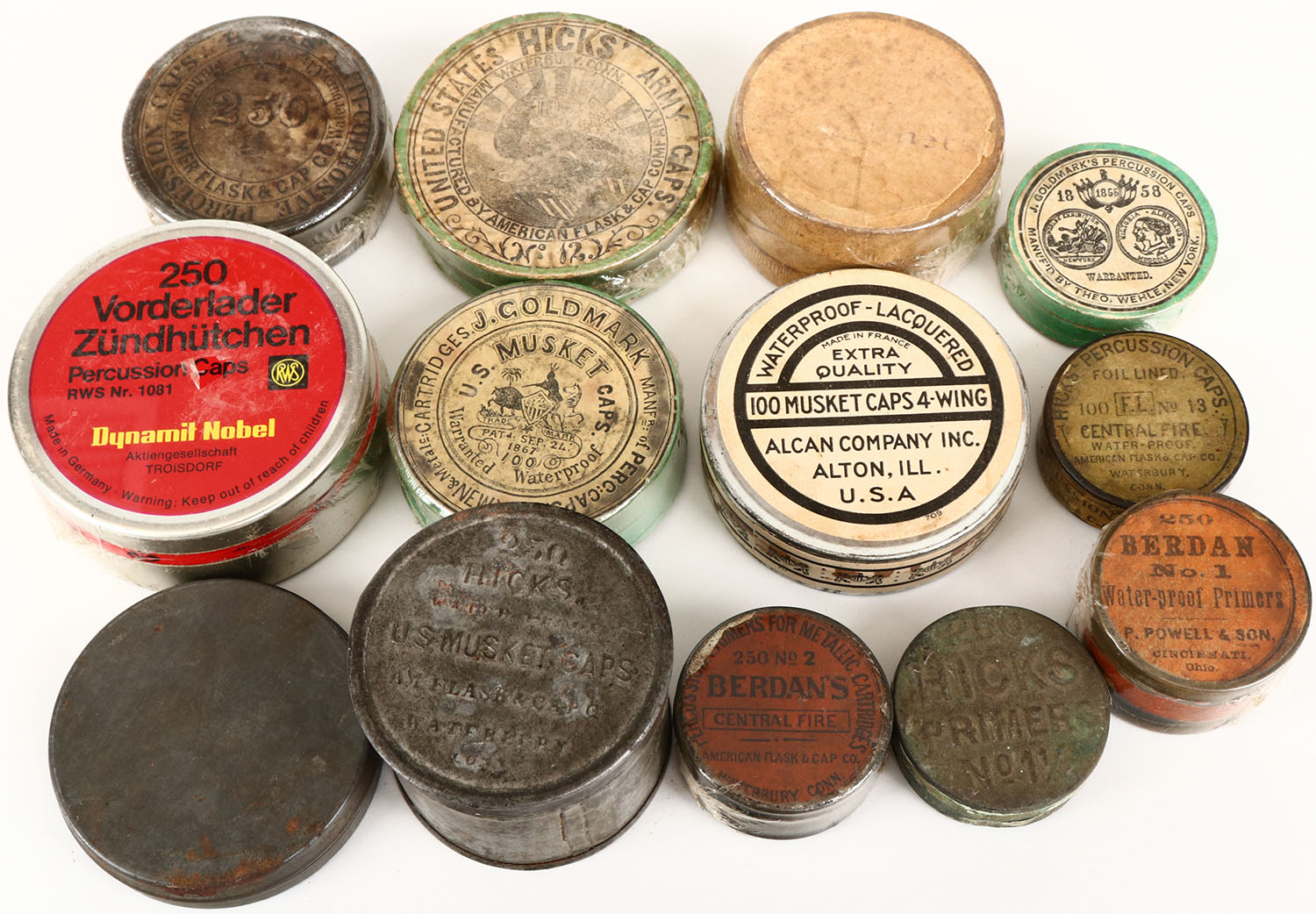 Very large lot of Early tins, percussion caps or primers, all partial. Grade: Very Good - Value: 20 to 200