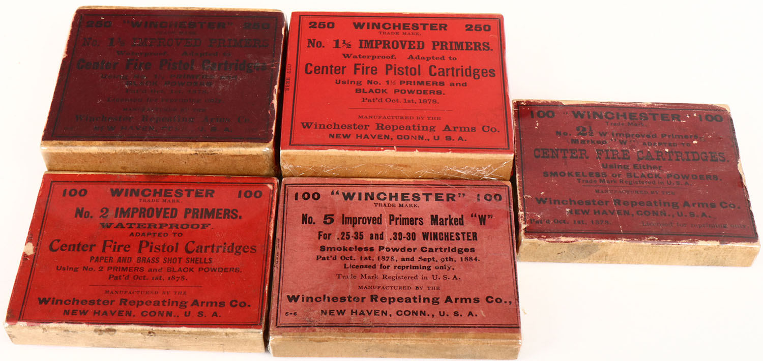 Lot of 5 Winchester primer boxes, 1 Full & Sealed and 4 Partial. Grade: Very Good ++ - Value: 10 to 50