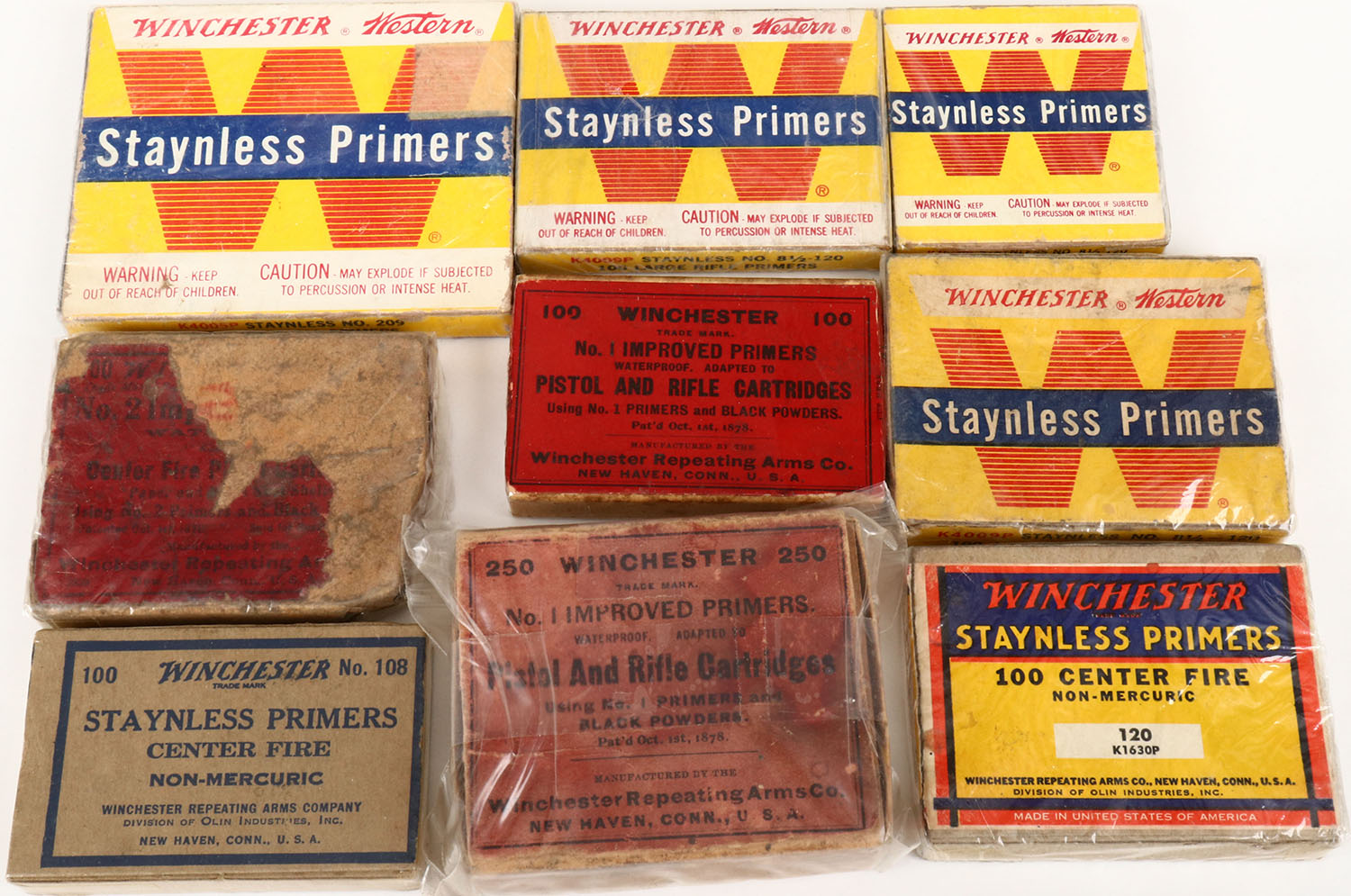 Lot of 9 Winchester primer boxes, all Partial. Grade: Very Good - Value: 2 to 60