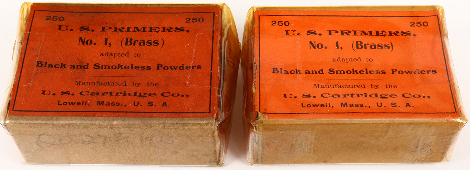 Lot of 2 US Primer box, 250 count, Partial, some age soiling. Grade: Very Good + - Value: 10 to 50