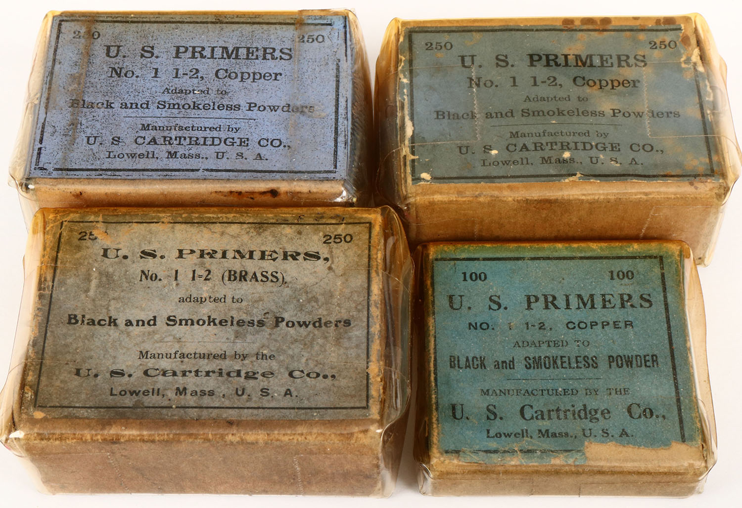 Lot of 4 US Primer box, 250 count, Partial, some age soiling. Grade: Very Good + - Value: 10 to 60