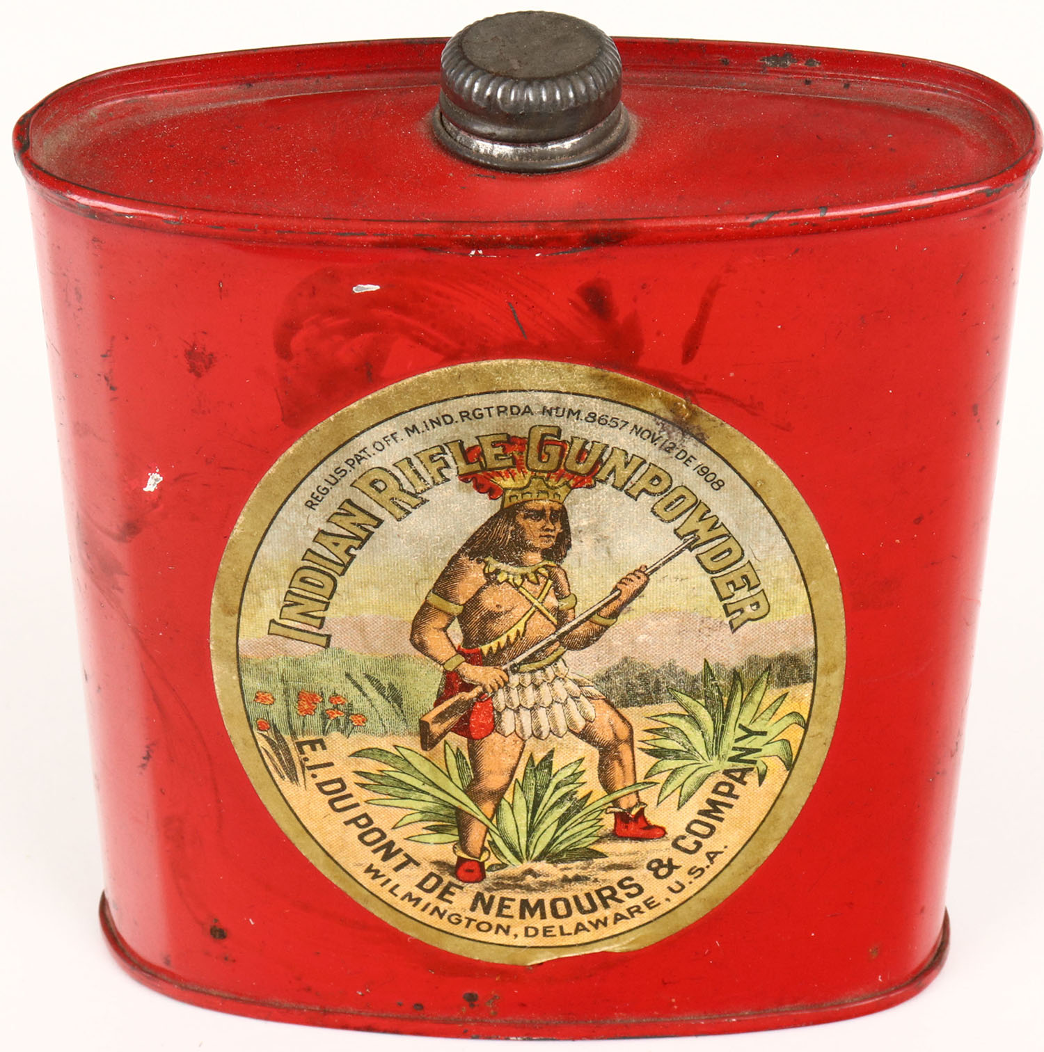 Small DuPont Indian Rifle Gunpowder tin, Empty, very bright and clean. Grade: Excellent - Value: 50 to 150