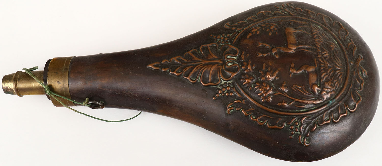 Brass powder flask, beautiful design, some age soiling. Grade: Very Good ++ - Value: 30 to 90