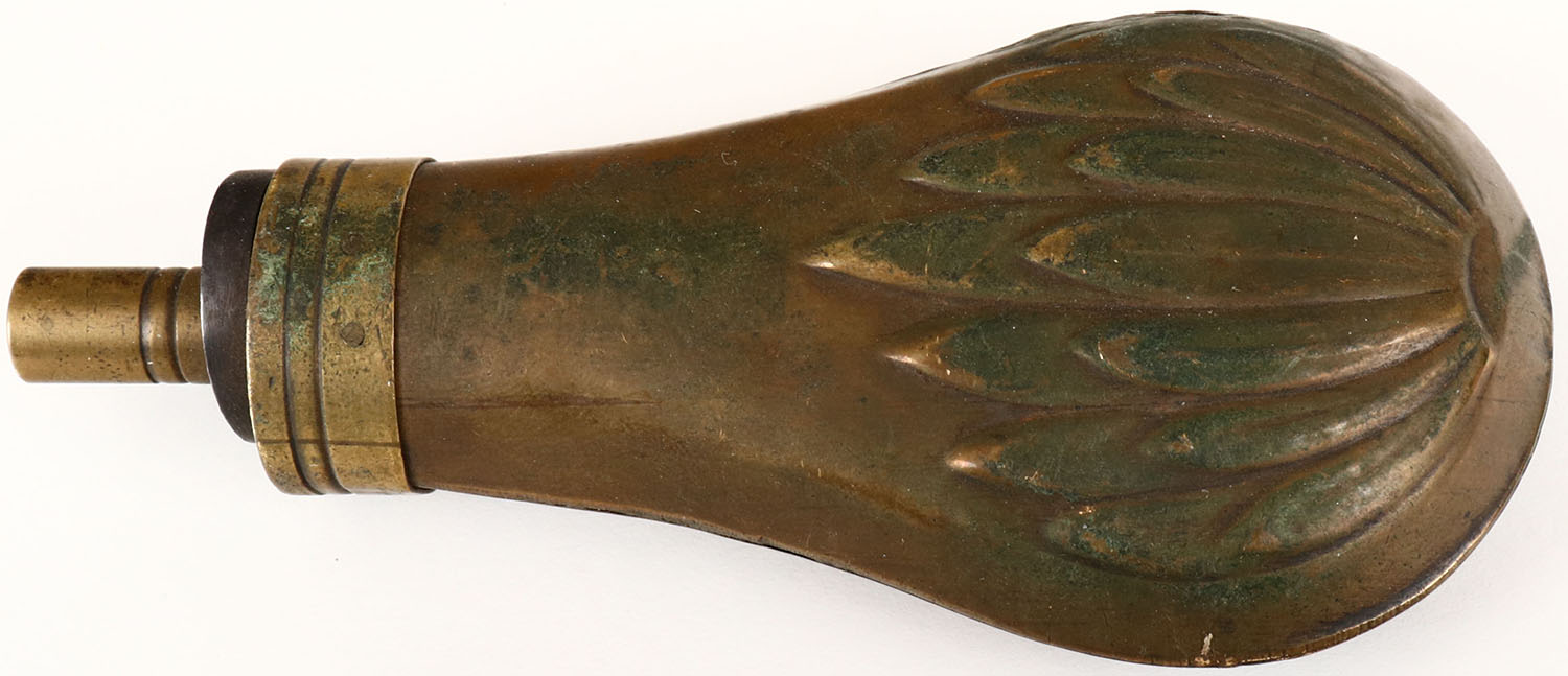 Small Brass powder flask, beautiful design, some age soiling. Grade: Very Good - Value: 10 to 60