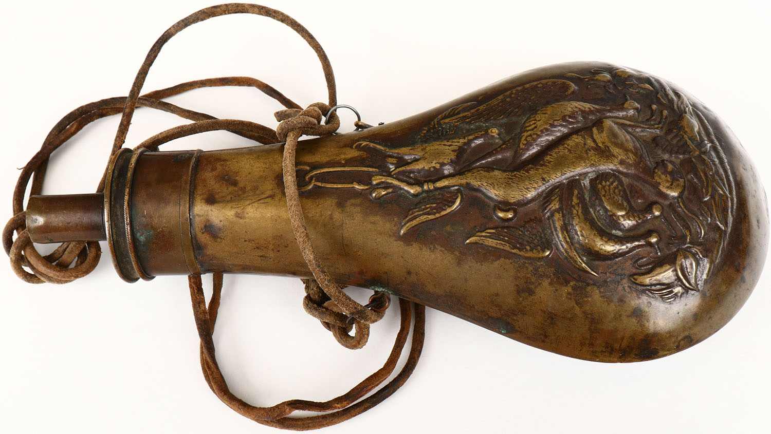 Brass powder flask, beautiful design, some age soiling. Grade: Very Good - Value: 20 to 80