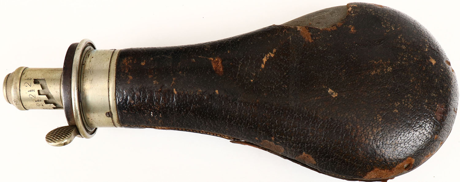 James Dixon & Sons Leather wrapped metal powder flask, has scuffing and age soiling. Grade: Very Good - Value: 40 to 150