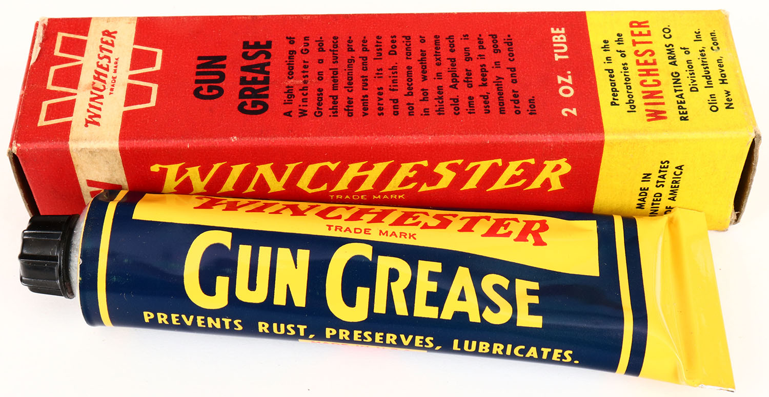 Winchester Gun Grease tube, in original box, tube is very bright and clean, box is solid with good color. Grade: Excellent + - Value: 20 to 60