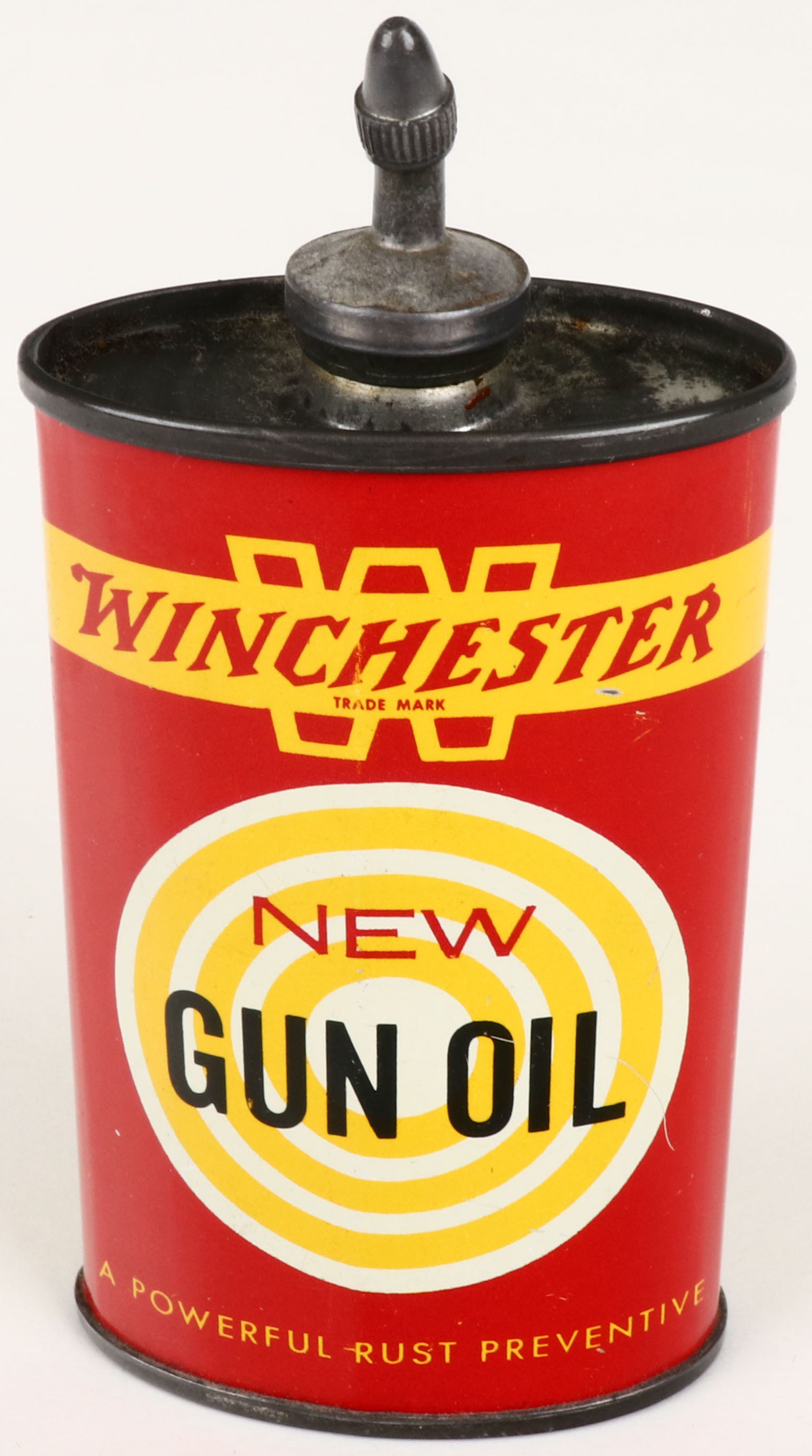 Winchester Oil Tin, New Gun Oil, lead spout & cap, Empty, very bright and clean. Grade: Excellent - Value: 16 to 60