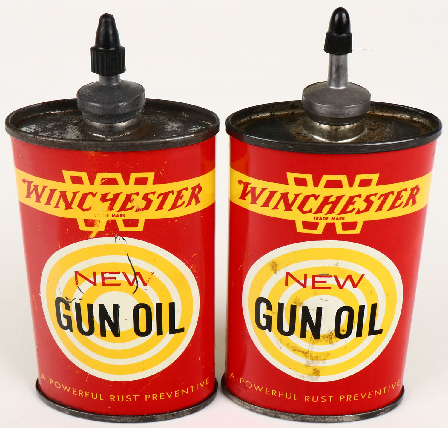 Lot of 2 Winchester Oil Tin, New Gun Oil, lead spout & cap, both partial, very bright and clean. Grade: Excellent - Value: 16 to 60
