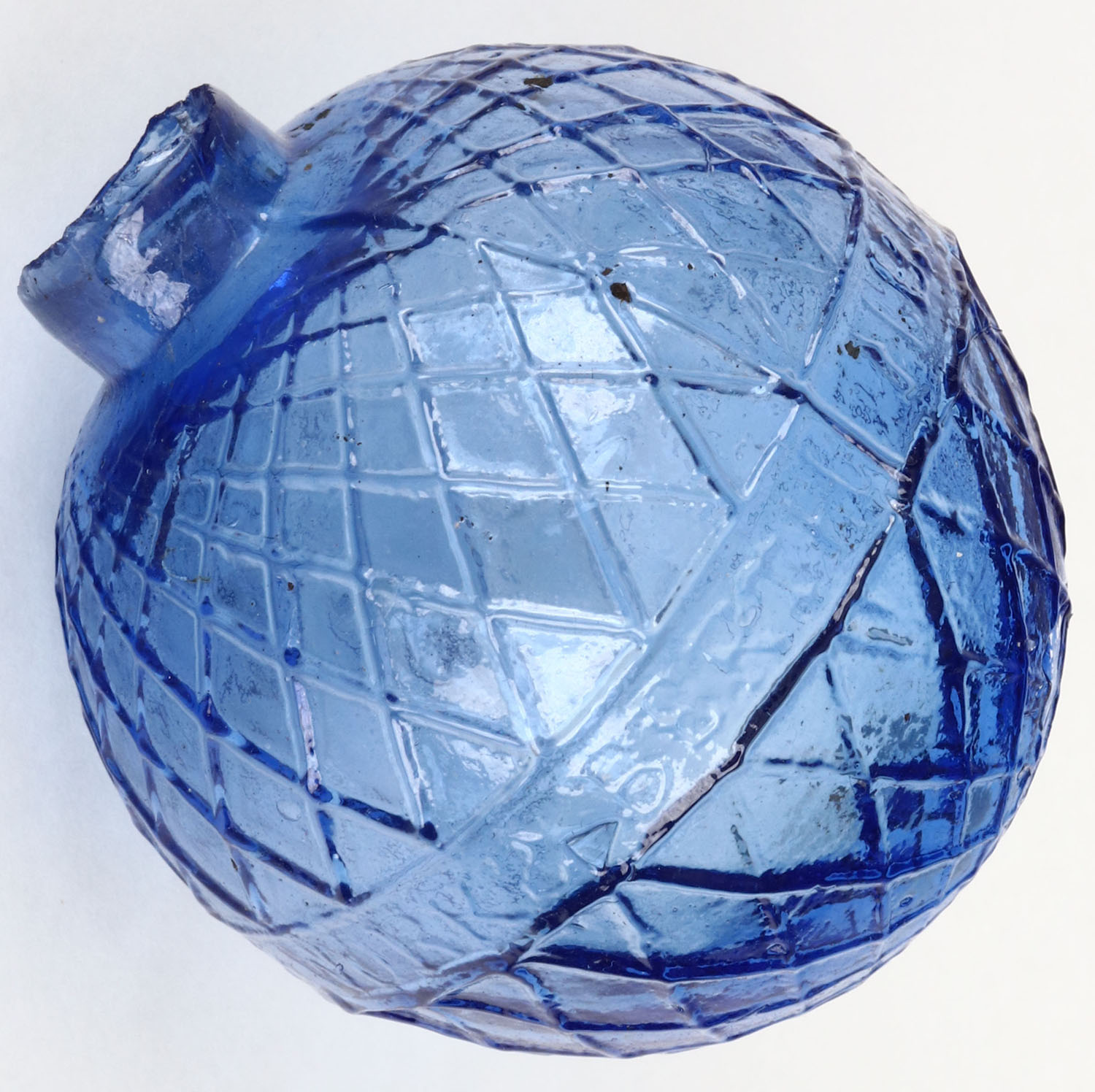 RARE! Blue Glass Target Ball, diamond pattern, ''N.B. Glass Works Perth'', 2 3/4'' dia., high neck, circa 1880-1900. Grade: Excellent ++ - Value: 200 to 600