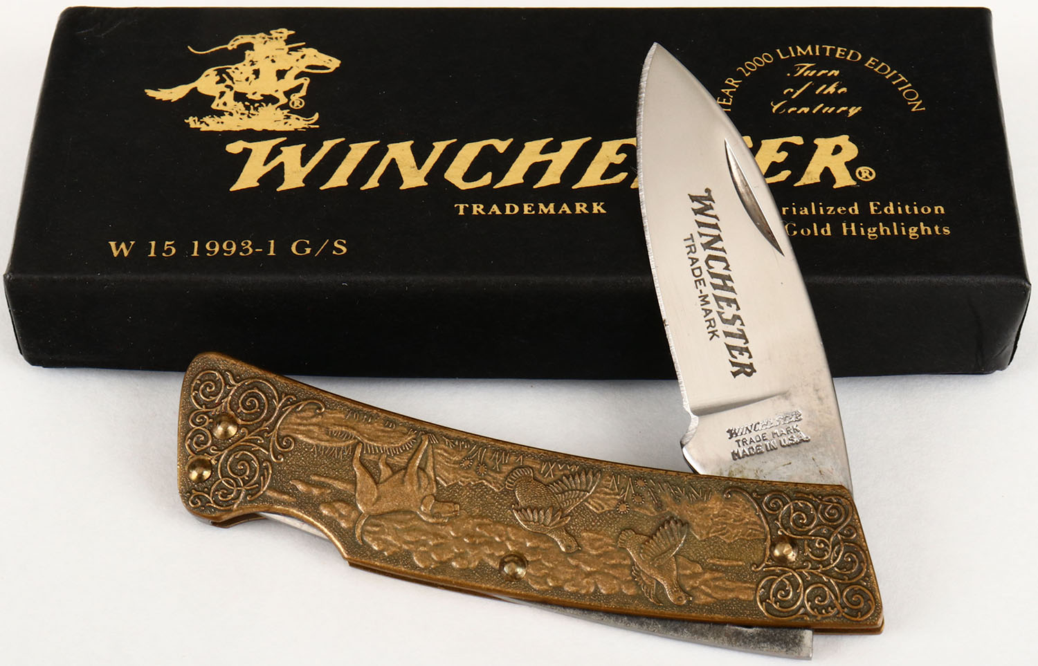 Winchester folding knife, 24K gold highlights, in original box, W 15 1993-1 G/S. Grade: MINT - Value: 40 to 100