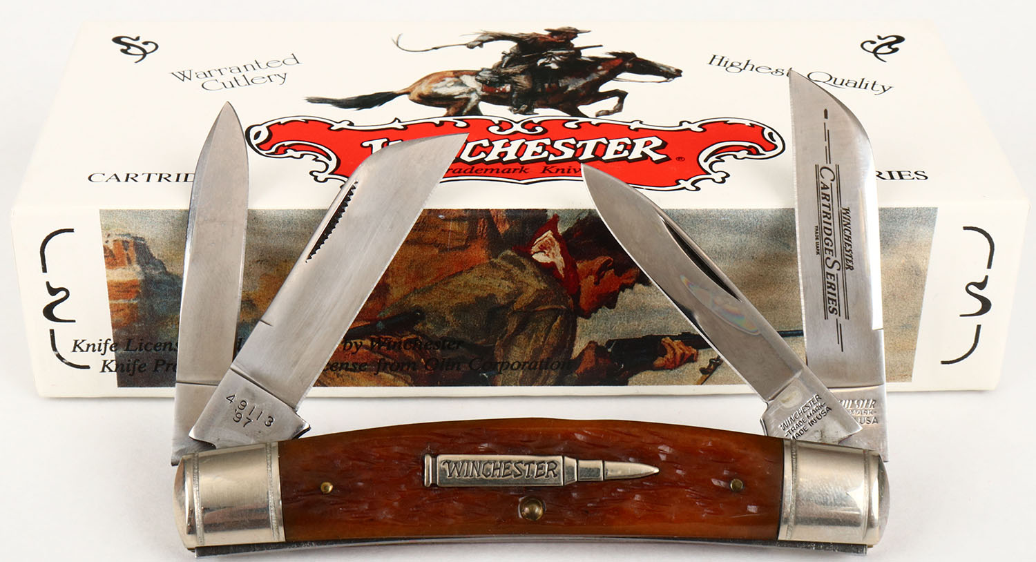 Winchester folding knife, in a Winchester box, W18 29107, burnt orange bone handle, may not be original box. Grade: MINT - Value: 60 to 100